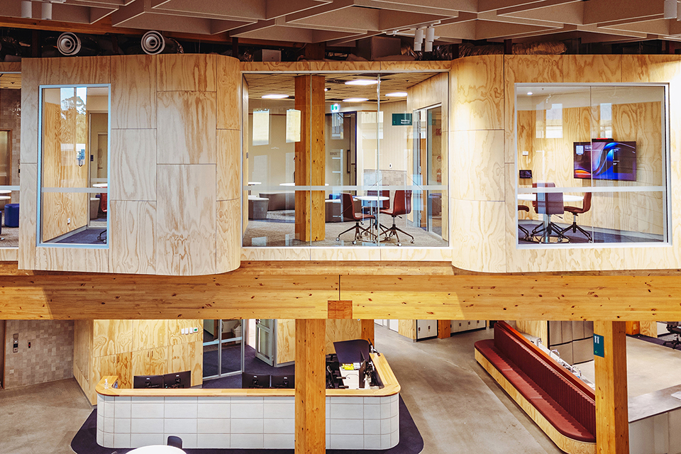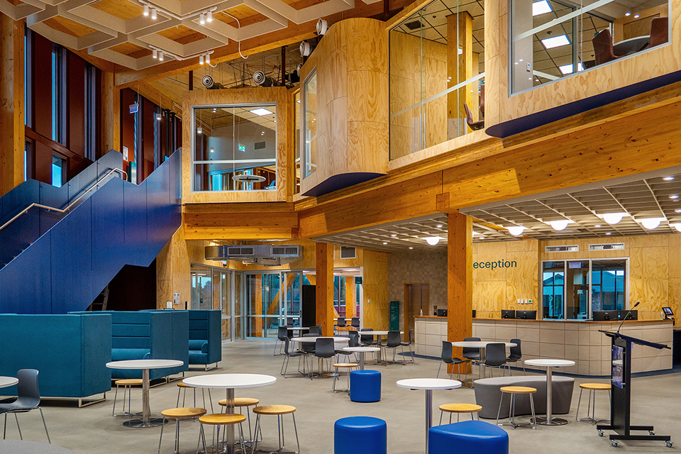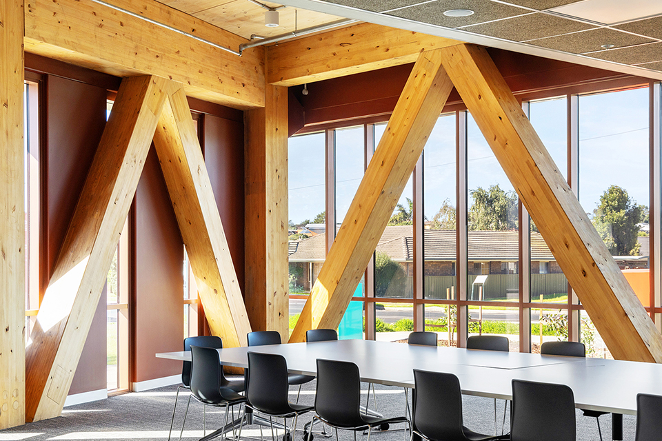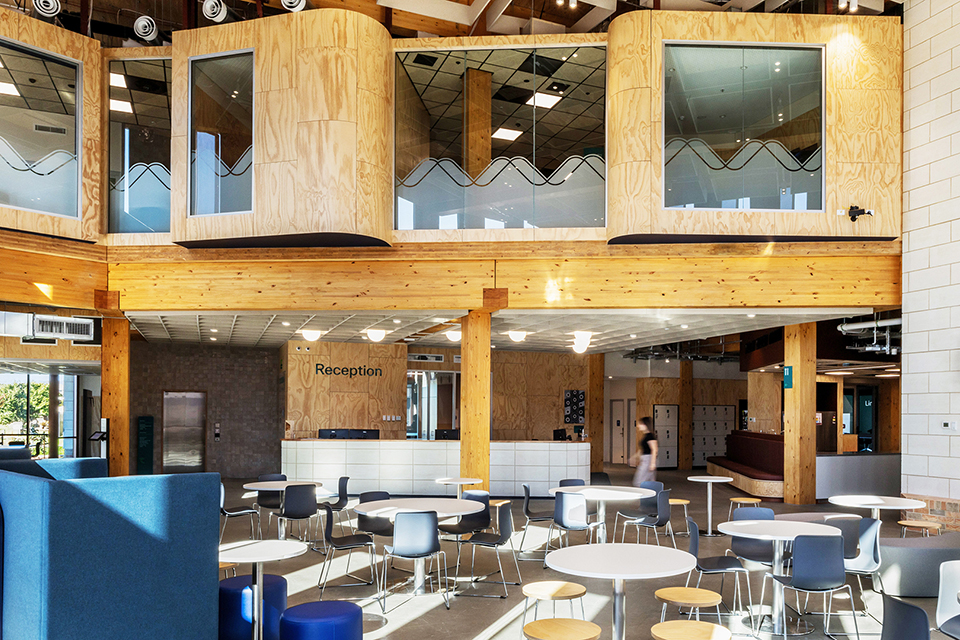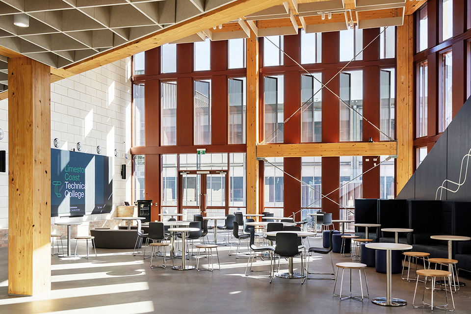In a striking design by architects Russell & Yelland, the building features local materials including the famed Mt Gambier limestone block cladding and CLT/GLT timber from the nearby manufacturing plant, as well as intentionally exposed ceilings to showcase the building’s ‘bones’ in keeping with it’s function as a technical college.